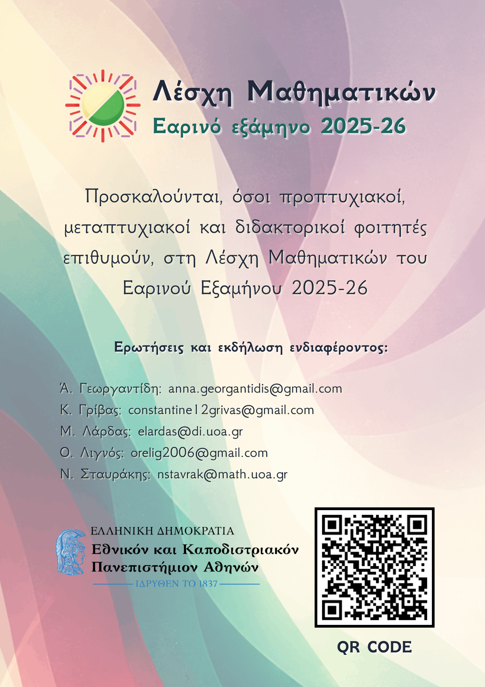 This spring semester (2025-26) the Mathematics Group of graduate and doctorate students will continue. Organised by Anna Georgantidi, Konstantinos Grivas, Emmanouil Lardas, Orestis Lignos and Nektarios Stavrakis.